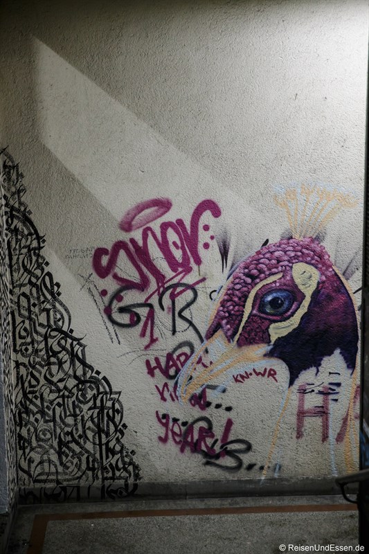 Graffiti und dann ein Aufzug, in dem ein Schild war, dass 90% aller Transporte erfolgreich waren. Meine Fahrt war fast erfolgreich.