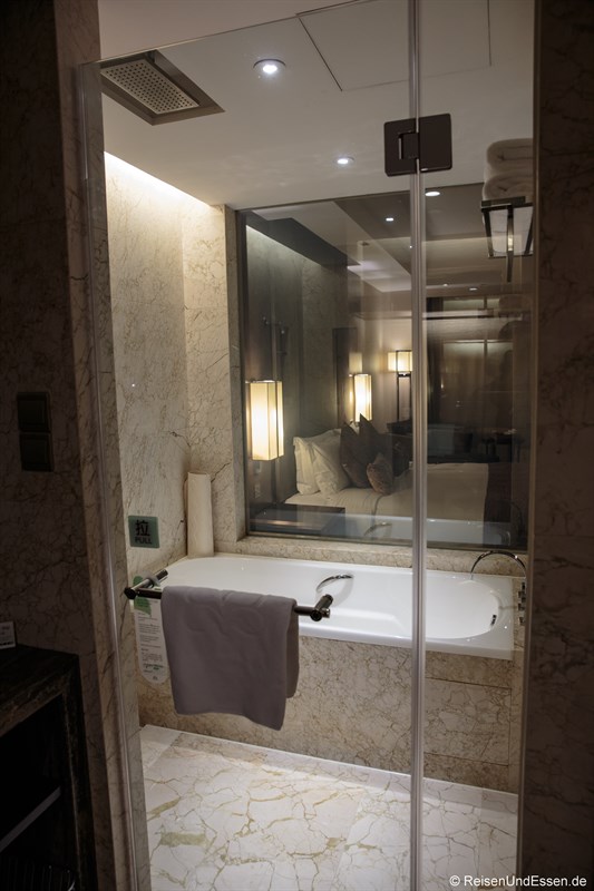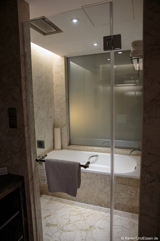 Das Zimmer hat ein sehr geräumiges Bad mit Badewanne und einer Regendusche. Mich hat hier die Regendusche absolut begeistert. Nach rechts auf dem Bild gibt es noch einen begehbaren Kleiderschrank.