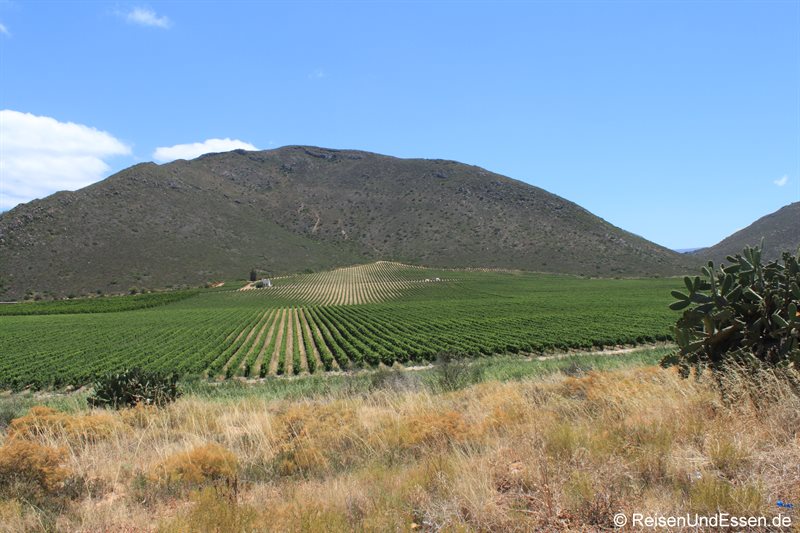 Unser heutiges (geplantes) Tagesziel war Oudtshoorn. Vor uns lagen ca. 420 Kilometer. Zuerst ging es über die Autobahn N1 in nordöstlicher Richtung raus aus Kapstadt. Es war gut warm und wie ließen die nächsten Tage die Fenster immer einen Spalt offen (auf die Klimaanlage wollten wir verzichten). Der Autobahn folgten wir bis Worchester und von dort aus ging es Richtung Westen nach Robertson, das 26.000 Einwohner hat. Die Gegend um Robertson ist bekannt als Weinanbaugebiet und Robertson selbst liegt zwischen zwei Tälern.