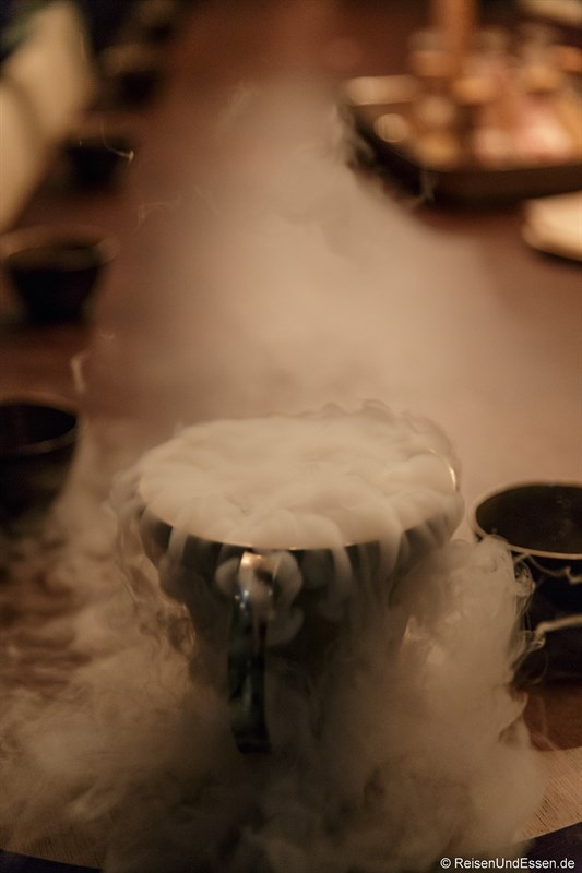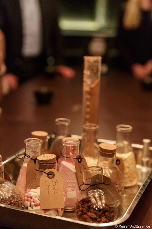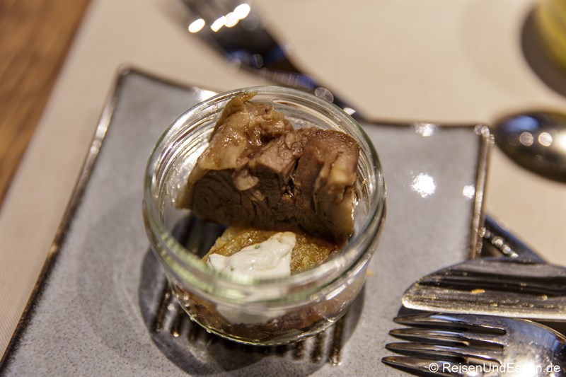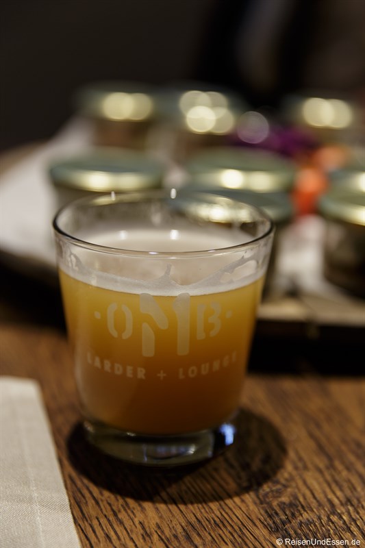 Neue Gläschen wurden uns serviert. Diesmal mit warmen Inhalt. Es machte mir sehr viel Spaß den Inhalt der verschiedenen Gläser zu probieren. Besonders der Wolfsbarsch und das Lamm haben mich geschmacklich beeindruckt. Dazu noch ein frisches Bier aus einer kleinen Privatbrauerei, das sehr gut dazu passte (dazu mehr weiter unten).