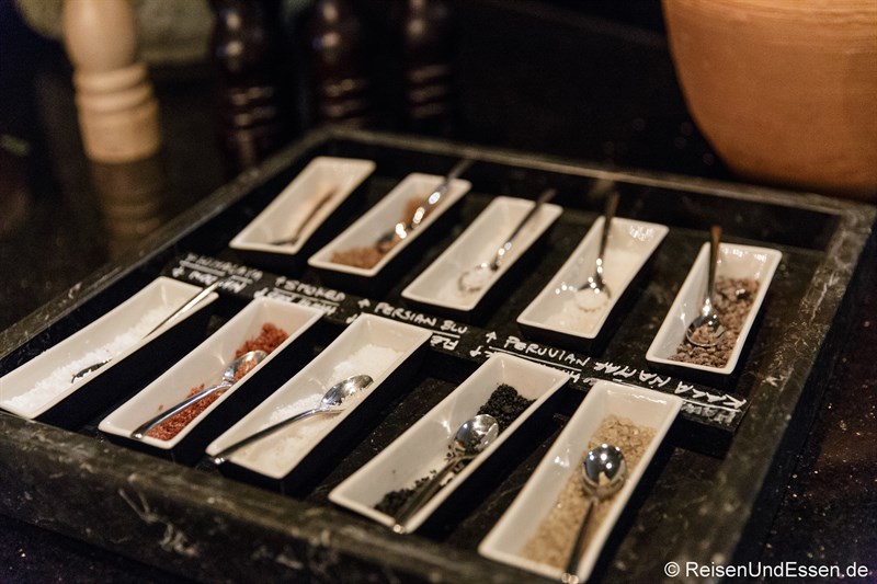 Die Auswahl an Salz und Gewürzen war für die Hochrippe gedacht, die als Hauptgang serviert wurde. Zart rosa und raffiniert zubereitet.