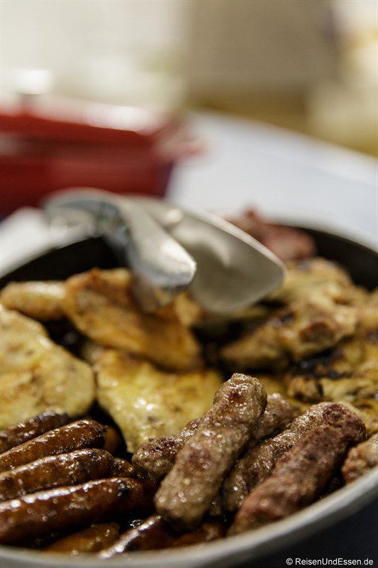 Die Gläschen animieren natürlich auch etwas zum “Spielen”. Meine Auswahl an kalten Vorspeisen. Ganz oben Ajvar, eine Würzpaste aus Paprika. Dies ist ein kuliarisches Merkmal für den Balkan.