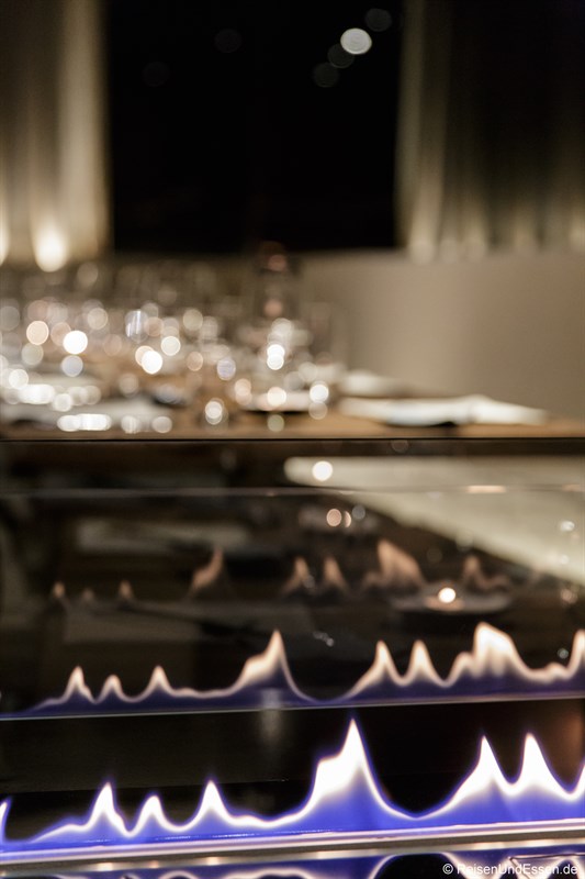 Nachdem ich jetzt bereits das OMB Larder Morgens und Mittags kennengelernt hatte, war es auch an der Zeit am Abend das Restaurant zu besuchen. Am Abend wirkt das Restaurant mit den Brauntönen und dazu noch das Feuer sehr stimmungsvoll. In dieser Umgebung fühle ich mich schon sehr wohl und freute mich auf das Diner.