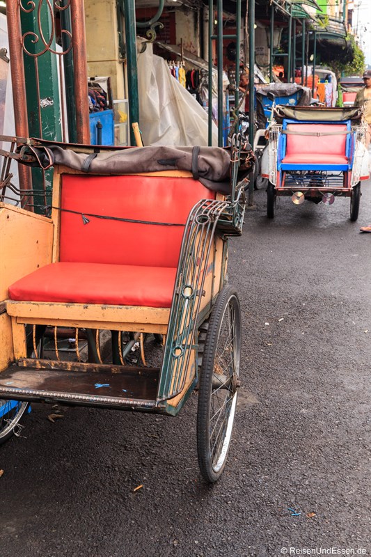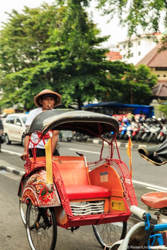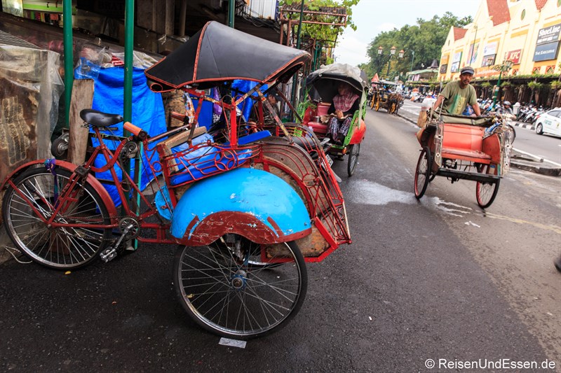 Nach der Besichtigung von Borobudur fuhren wir nach Yogyakarta. Eine Möglichkeit ist mit der Fahrrad-Rickscha Yogyakarta zu erkunden. Die Fahrrad-Rikscha hat hier den Namen Becak.Als wir entlang der Jalan Malioboro gingen fielen mir sofort die vielen Fahrrad-Rikschas auf.