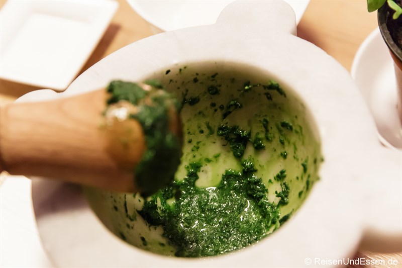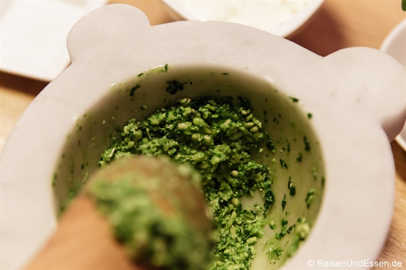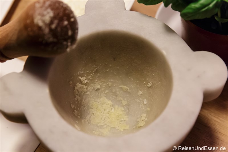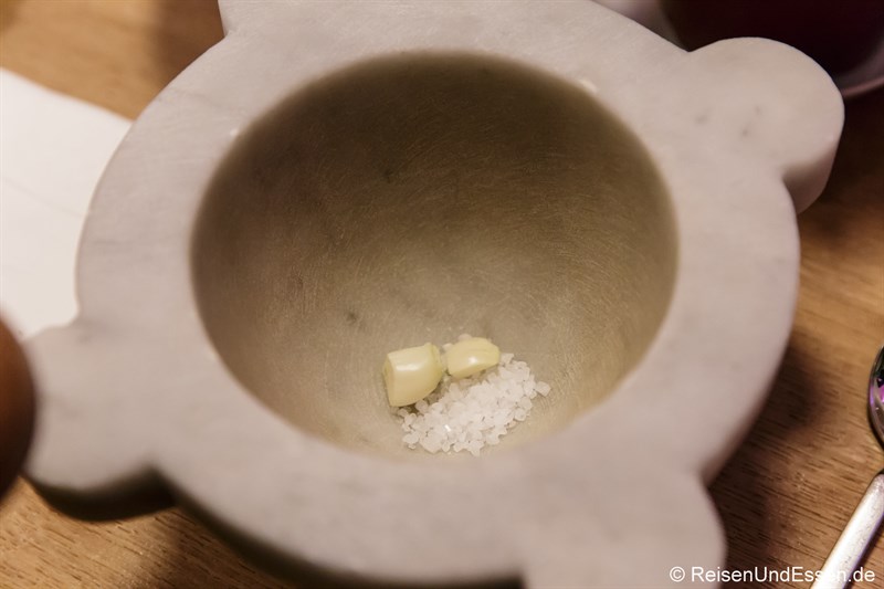 Die Zubereitung als solches ist recht einfach, wenn man alle Zutaten bereit gestellt hat. Die Zutaten werden nacheinander in den Mörser gegeben und immer wieder gründlich zermahlen. Gestartet wird mit dem Salz und Knoblauch im Mörser.