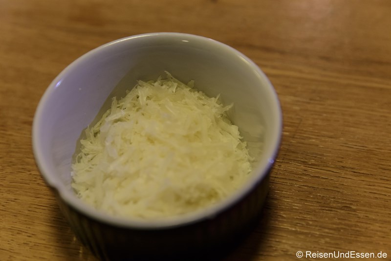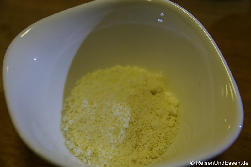 Ein Blick auf die beiden Käsesorten: Links der Parmesan und rechts der Fiore Sardo. Fiore Sardo ist ein Schafskäse, der nur in Sardinien hergestellt werden darf und für das original Pesto alla Genovese verwendet wird.