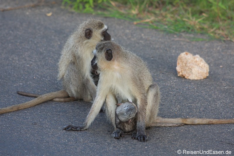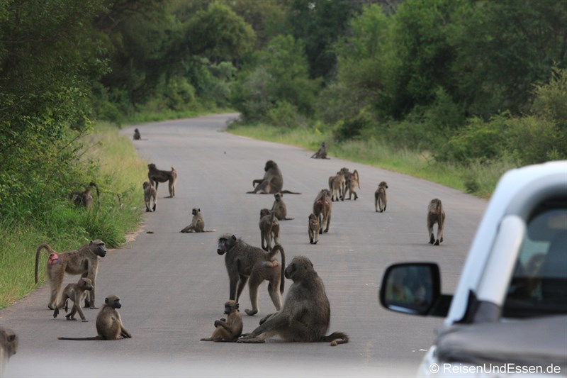 Nachdem uns am Vortag ein Elefant den Weg versperrte, war es nun eine Affenherde, die sich auf der Straße tummelte.