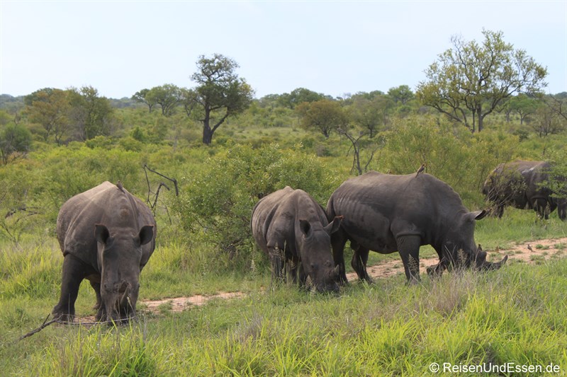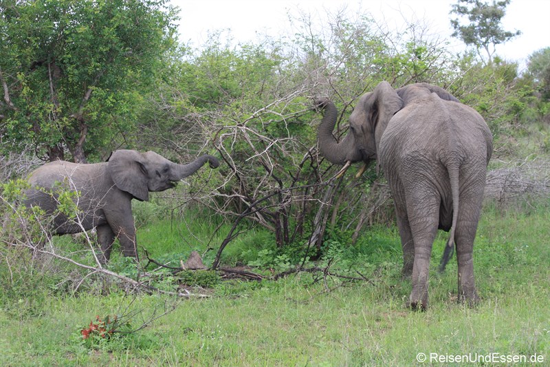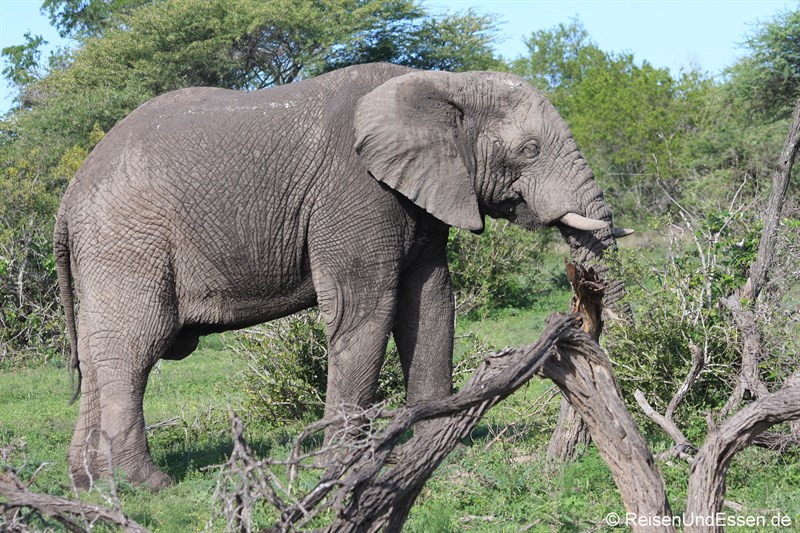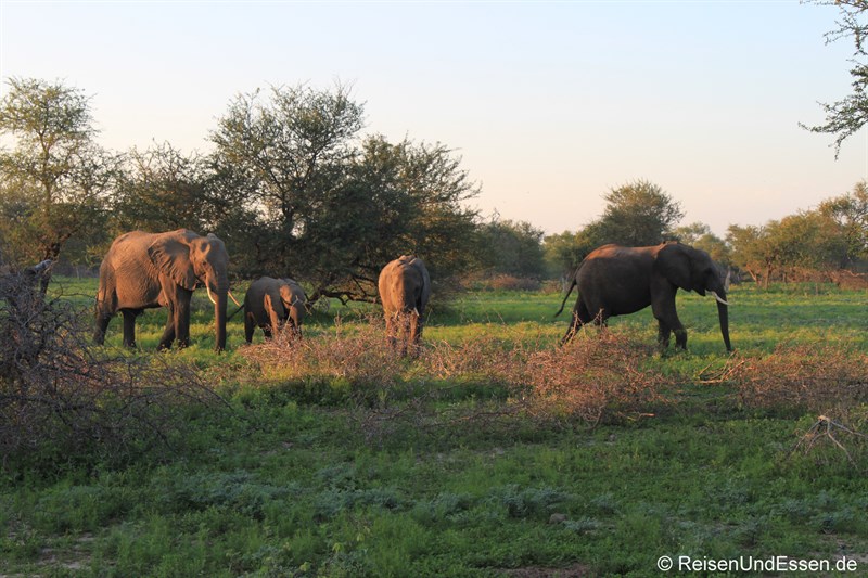 An den beiden nächsten Tage hatten wir mit der Pirschfahrt den gleichen Ablauf. Kurz nach 04:00 Uhr wurden wir aus dem Schlaf gerissen. Kurz Wasser ins Gesicht, Anziehen und zum Frühstück. Es gab ein recht trockenes Muffin ähnliches Stück zum Essen und eine Tasse Tee in die Hand. Verschlafen ging es dann in den Jeep. Doch jeder schaute gleich gespannt aus dem Fahrzeug heraus. Wir wollten ja nichts übersehen. Abwechselnd entdeckten wir verschiedene Tiere. Im Laufe des Morgens sahen wir weitere Elefanten. Elefanten sind sehr zahlreich im Krüger Nationalpark