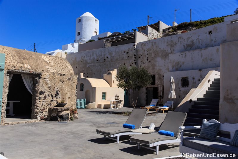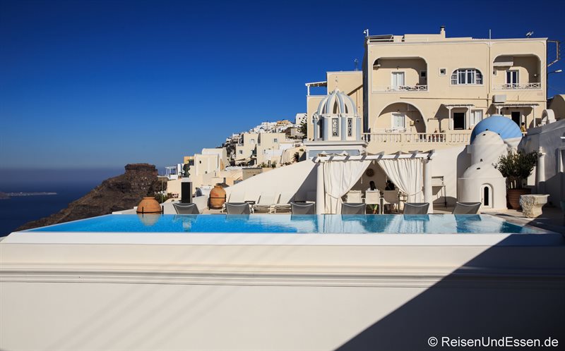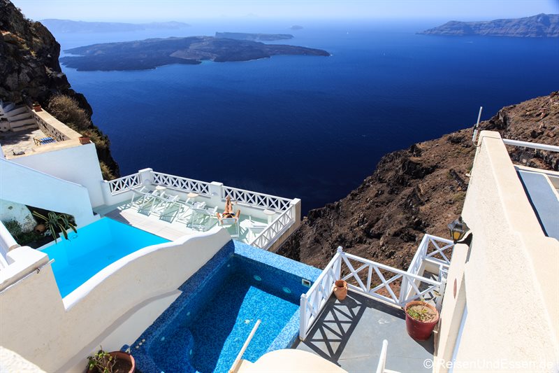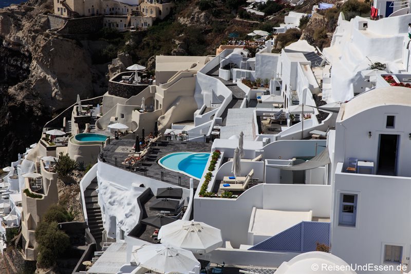 Von einem Zimmer im Hotel bis zur luxuriösen Suite gibt es eine grosse Bandbreite. Unser Eindruck ist, dass es von Fira in Richtung Oia immer luxuriöser wird.