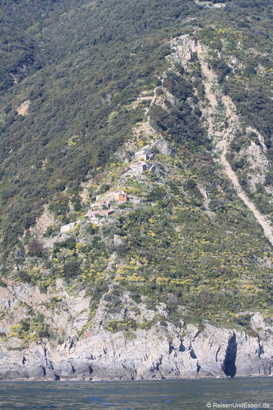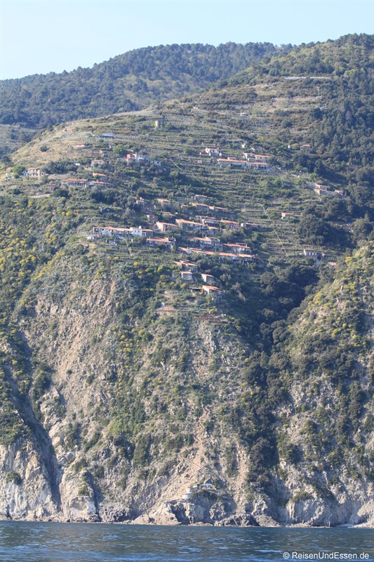 Vom Schiff aus können wir einen Teil des Wanderwegs hoch oben sehen und auch noch Dörfer und Häuser, die an der Steilküste kleben.