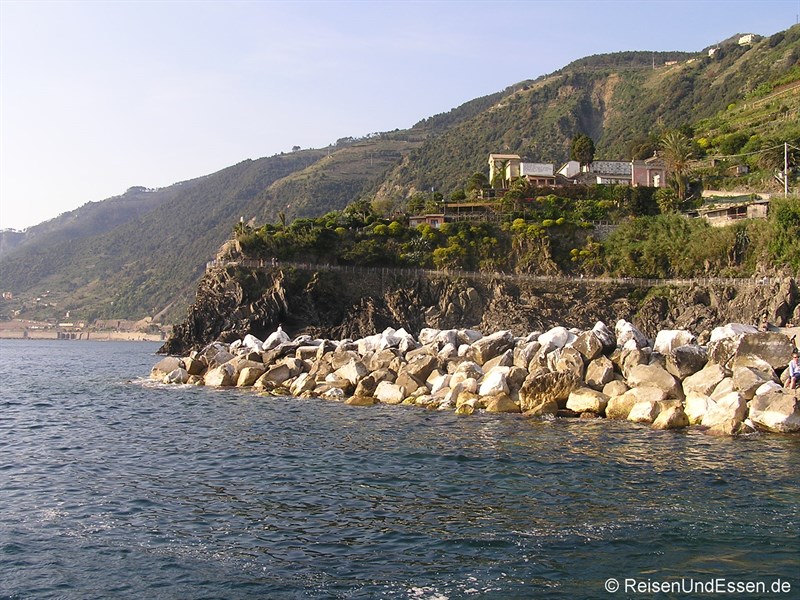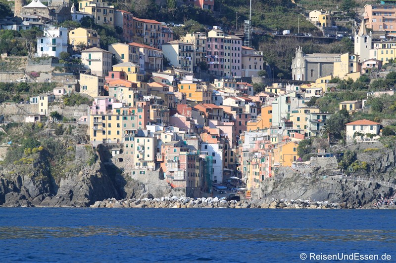 Bei der Schifffahrt werden nacheinander alle 5 Dörfer der Cinque Terre angesteuert. In dem Bericht Was du über die 5 Orte der Cinque Terre wissen musst sind die Dörfer von der “Landseite” beschrieben. Zuerst Riomaggiore und danach der Blick auf die Via dell’Amore.