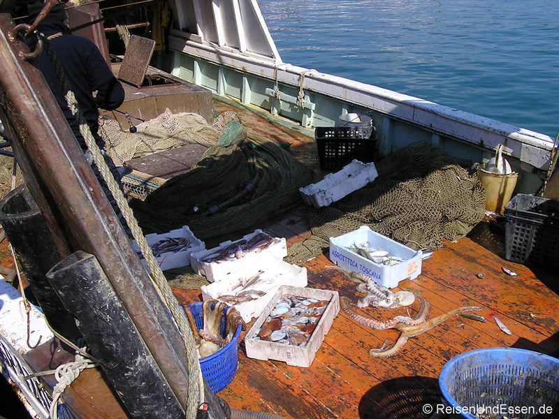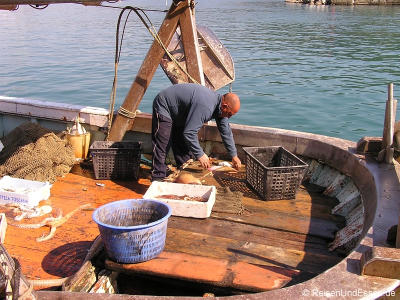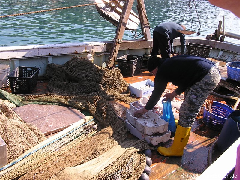 Einige Fischer sind im Hafen mit ihrem Fang beschäftigt.
